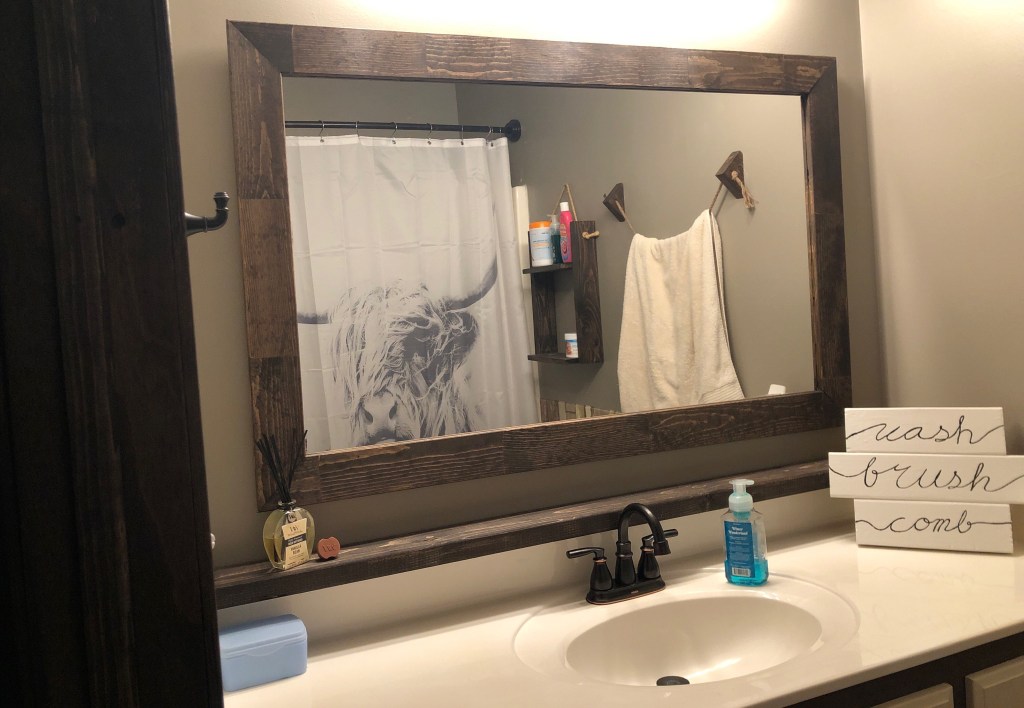 Recently, in our bathroom, I noticed we had some ugly marks on the outside of our mirror. I’m sure many people didn’t notice. I did and my first thought, I must take care of it! I had some extra baseboard from when I replaced the trim in our hallway. I made a frame for the mirror to hide the ugly spots! I used Minwax Gel Stain, coffee color to match the trim color. The result….