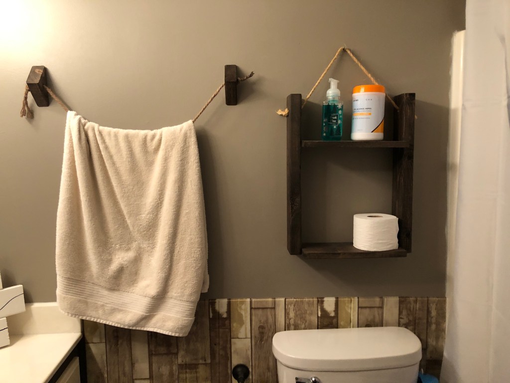 In our bedroom bathroom, we do not have a lot of room for storage. I had a neat idea to add a towel holder. I strategically placed it so the towels could be easily accessed from the shower. I don’t think it looks too bad!