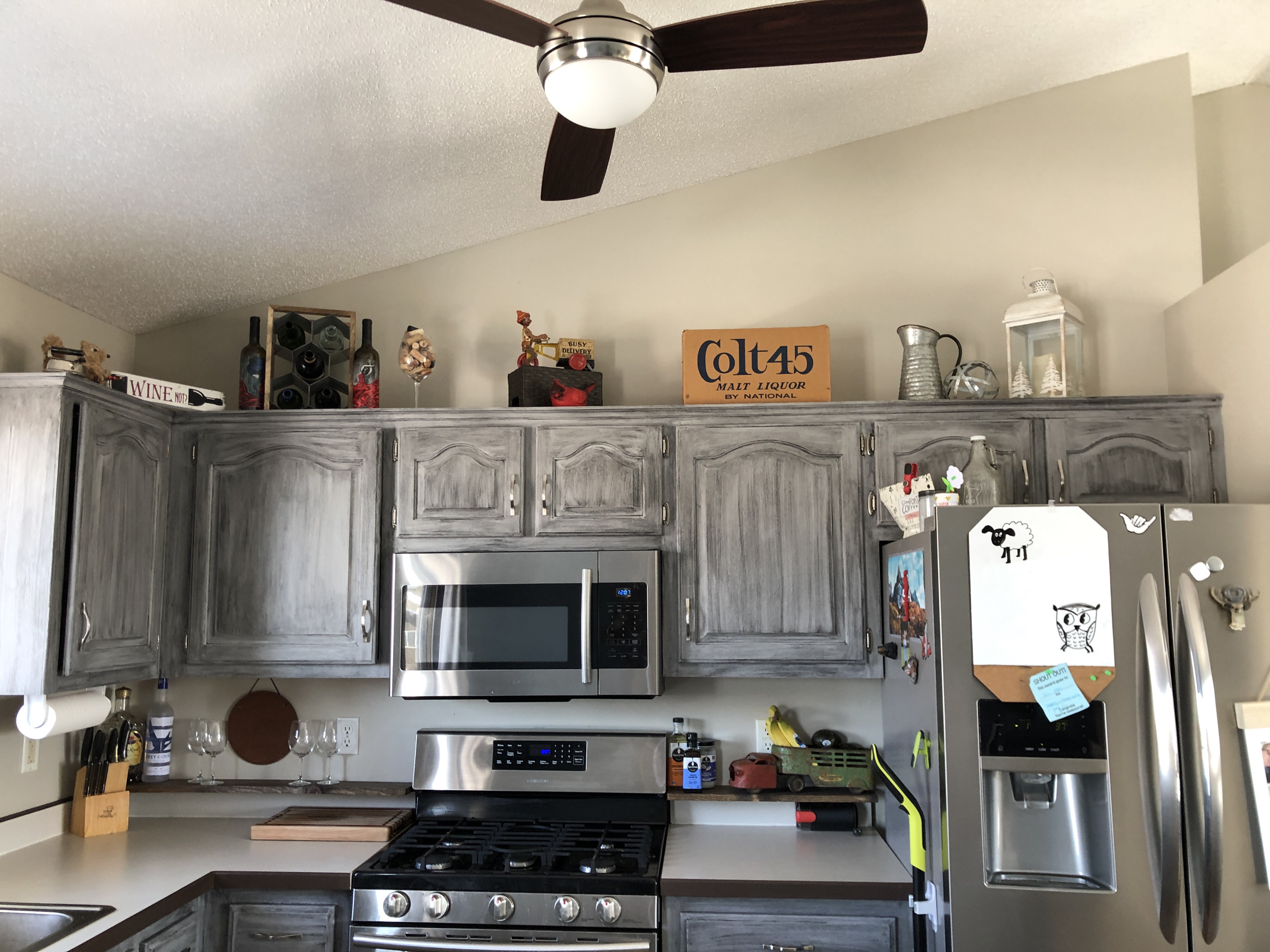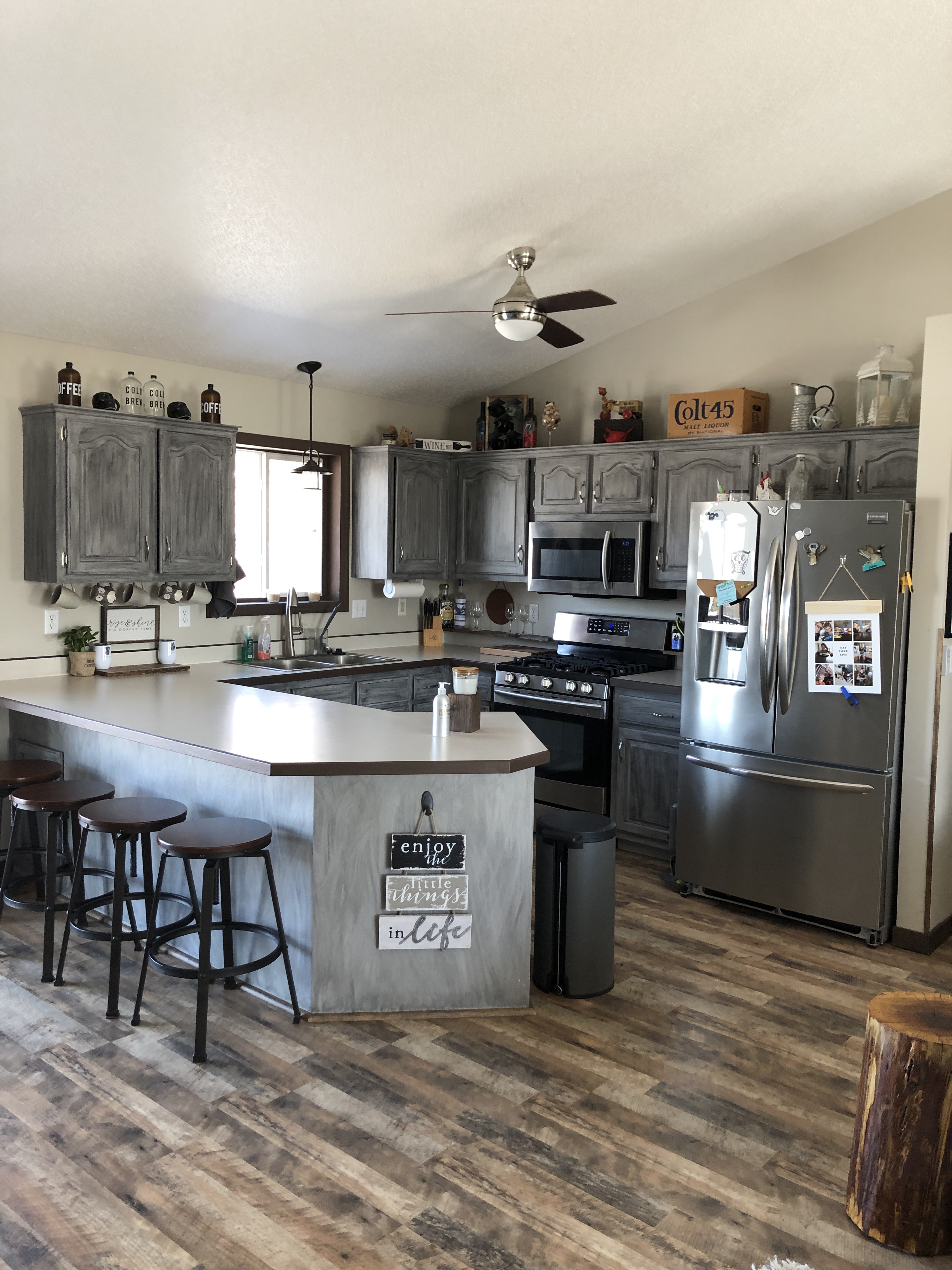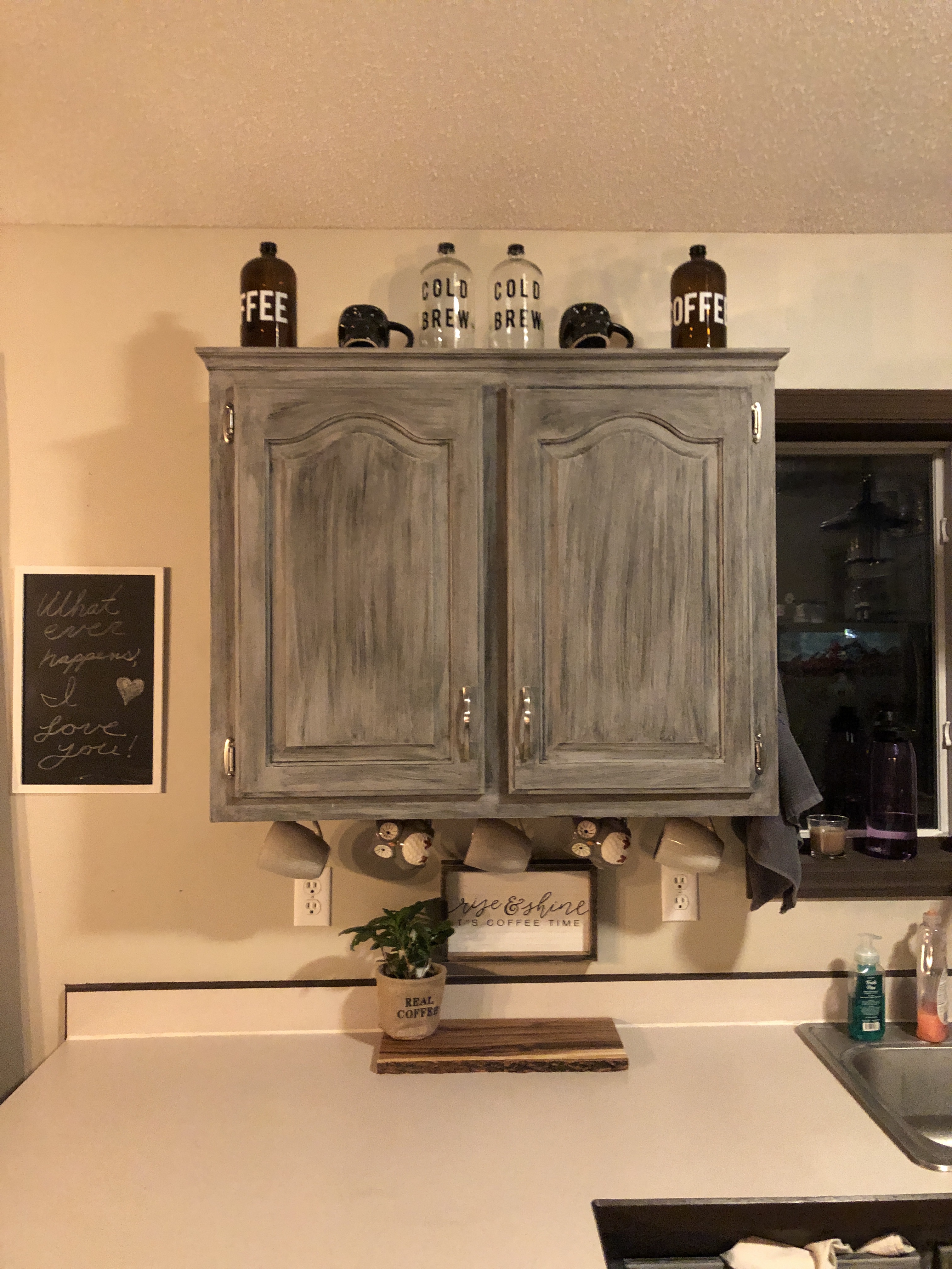 We moved in about two years ago and our trim and cupboards were light maple stain. I replaced all the trim in our upper level because the previous owners had painted all over the trim and it didn’t look very nice. The first color I started with was Rustoleum Aged Gray Chalk paint. It was light and bright. I wanted to get a feel for the color, so I let it sit for a few weeks. I’m glad I did. The color was showing stains and dirty marks very quickly. I decided to add an additional coat of the chalk paint. Then, I added Rustoleum Smoke Glaze Finish. It was a gamble because I have never used glaze prior to this project and it was a new technique.