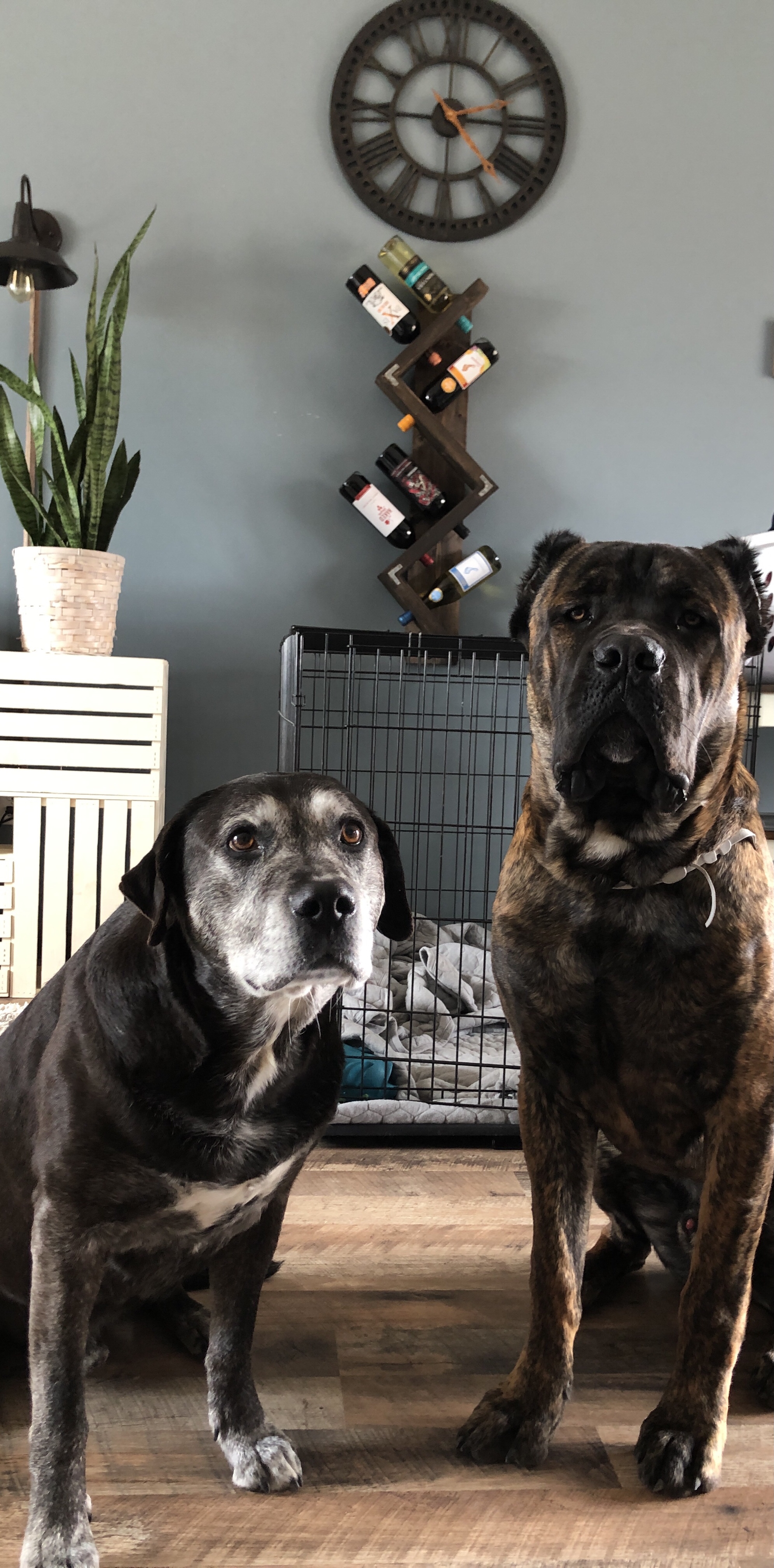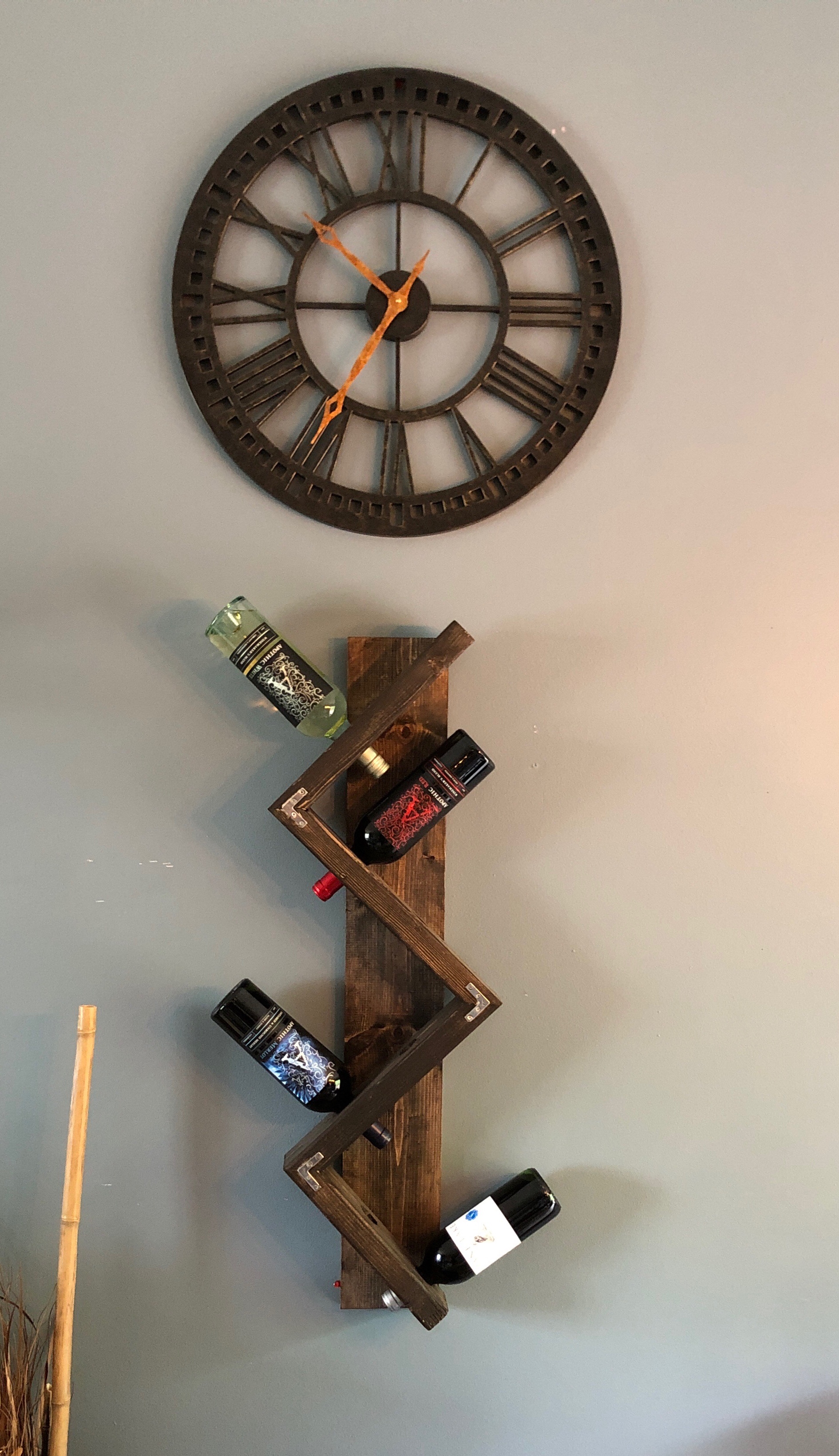 While I was completing this project I wanted something to add for holding our wine bottles. I researched different ideas and wanted to make something that was easier for a beginner. I had some extra stain, 2x4s and a 1×6 laying around and I figured I’d give it a shot. After a couple hours of cutting, glueing and staining, I had this….