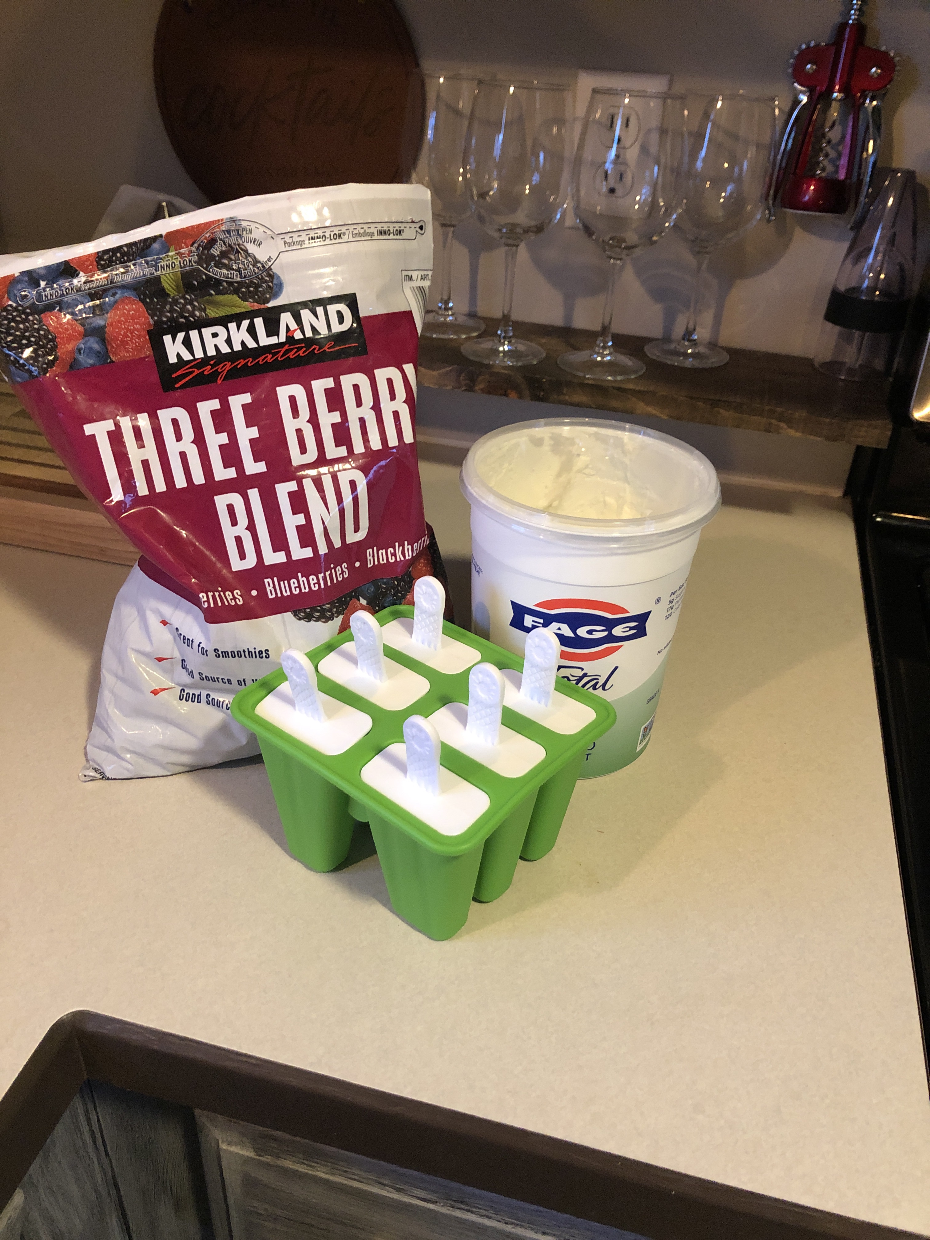 1. 1 cup Fage 2% yogurt and 1 cup Three Berry Blend frozen fruit.